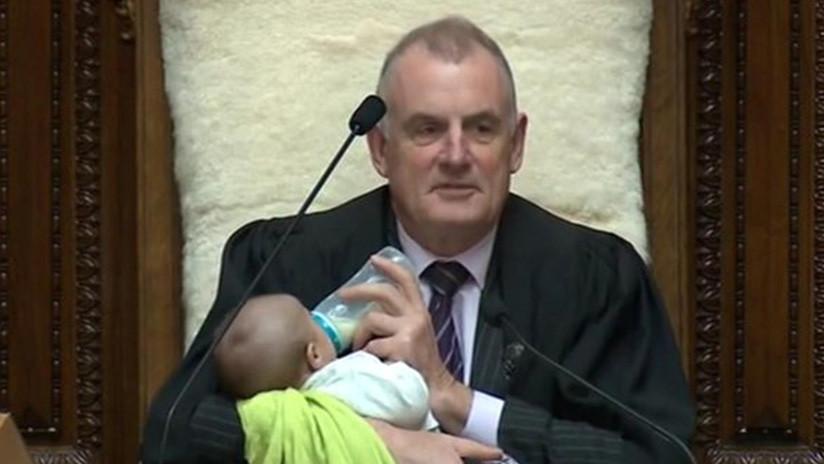 "Normalmente, la silla presidencial solo la utilizamos los presidentes, pero hoy un VIP se ha sentado conmigo", tuiteó la máxima autoridad del órgano legislativo, Trevor Mallard, junto con un par de fotos en las que aparece con el pequeño, al que alimenta con un biberón mientras preside un debate.