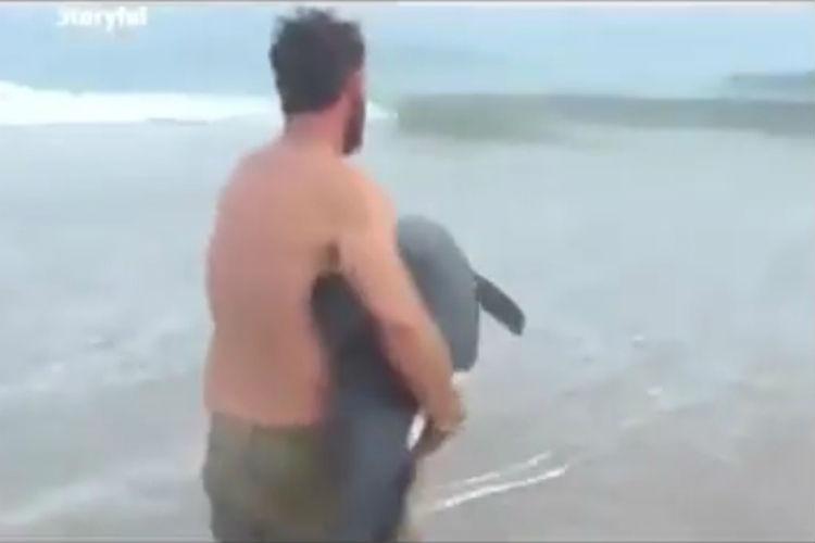 Dreyer, que subió el video en su cuenta de Facebook, explicó que junto con los turista que en ese momento lo acompañaban, vieron un delfín de la especie Benguela que aún se movía por lo que procedió a devolverlo al mar.