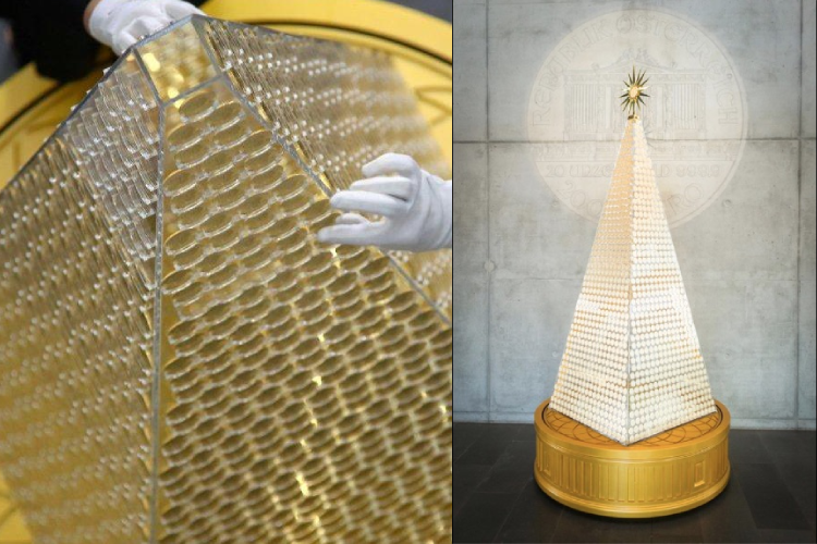 El árbol, según la empresa, está compuesto por 2.024 monedas de oro pegadas a mano a una pirámide de material acrílico. Las monedas tienen un peso total de 63 kilos y el árbol una altura de cerca de tres metros.