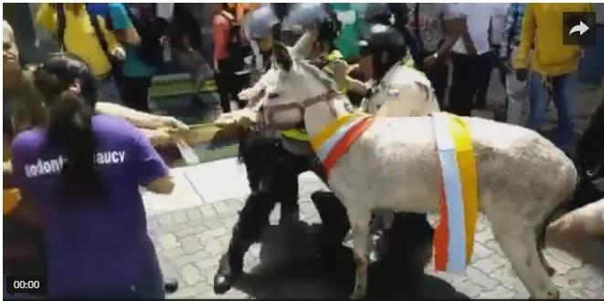 Esta fue la situación que se presentó en Sabana Grande cuando la Policía Nacional Bolivariana arrastró al animal y se lo quitaron a las personas que estaban protestando.