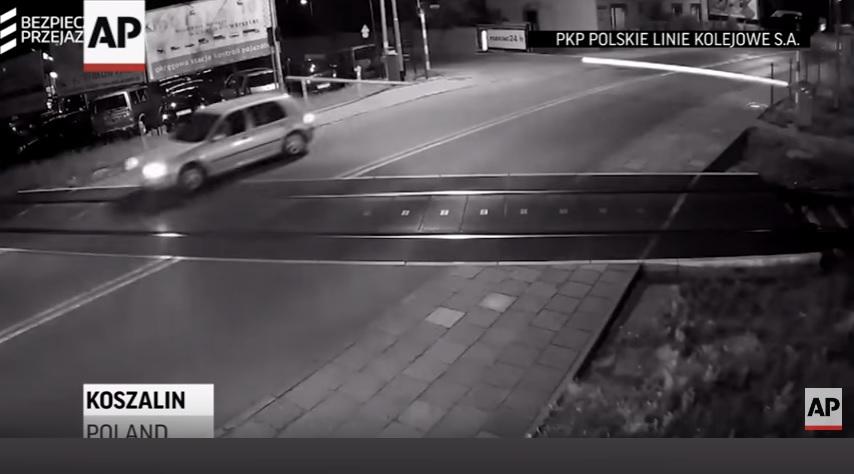 El incidente se produjo en Koszalin, en el norte de Polonia, y fue tomado en video por la empresa ferroviaria PKP. El tren rozó la parte trasera del auto, pero nadie sufrió heridas.