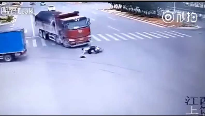 Un hombre, una mujer y una niña terminaron el el pavimento de una vía en China, luego de que se vieran involucrados en un accidente de tránsito. Pudieron haber muerto.