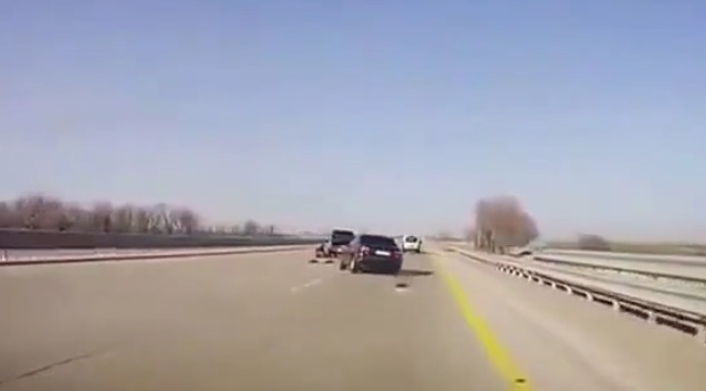 En Kazajistán, a este hombre no se le ocurrió idea mejor que cambiar la rueda de su coche en medio de la autopista. Provocó un grave accidente, pero salió ileso.