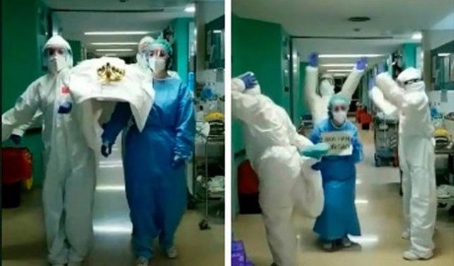 El video de casi un minuto empieza con uno de los médicos “interpretando” al coronavirus, arrastrándose por el pasillo, luego el personal sanitario lo fumiga con un desinfectante, que podría ser lejía.