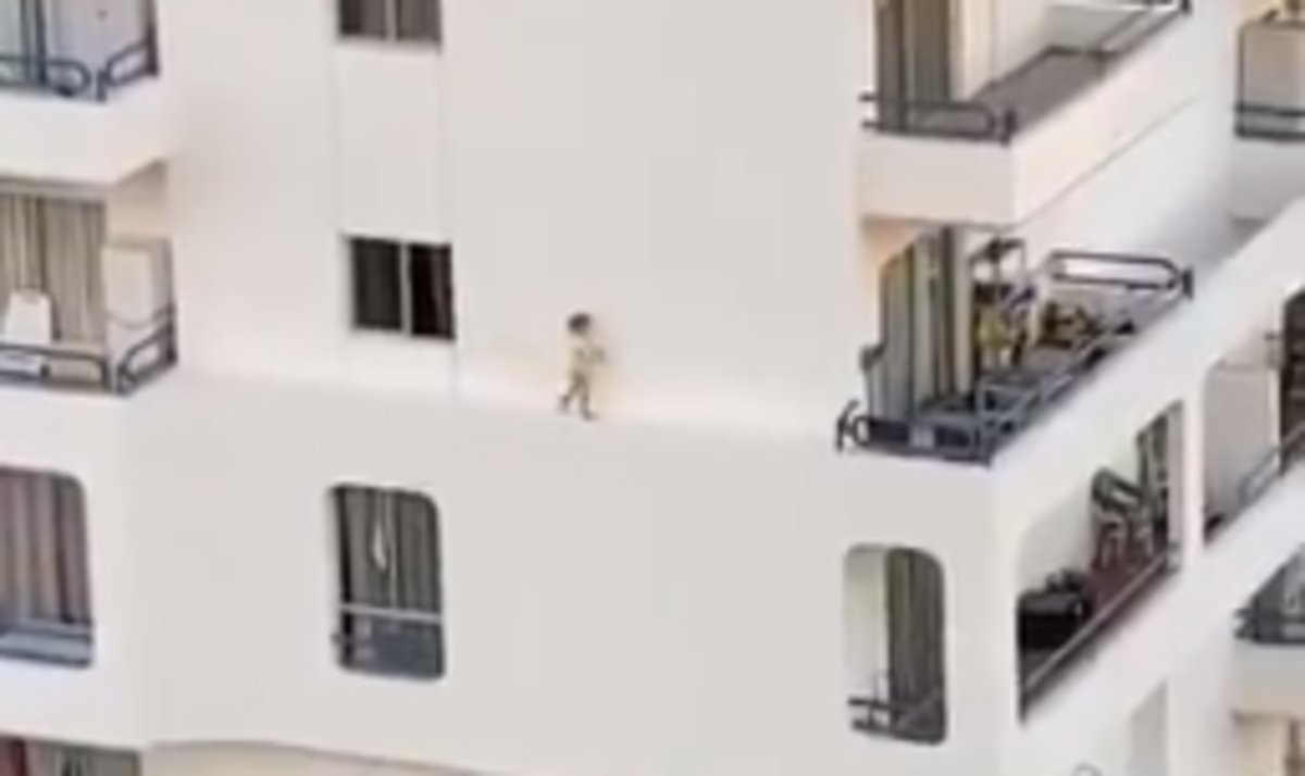 La pequeña sale de una ventana, recorre unos metros en dirección a un balcón, hace el ademán de entrar en ese balcón pero da la vuelta para volver al punto de partida.
