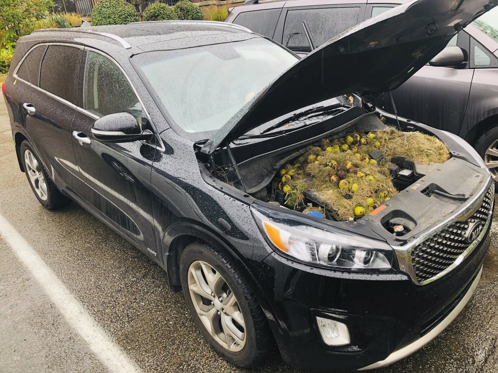 Chris Persic contó a la televisora KDKA-TV que su esposa le llamó para decirle que el vehículo tenía cierto olor a quemado. Cuando abrió el capó, encontró nueces y césped apilados sobre el motor.
