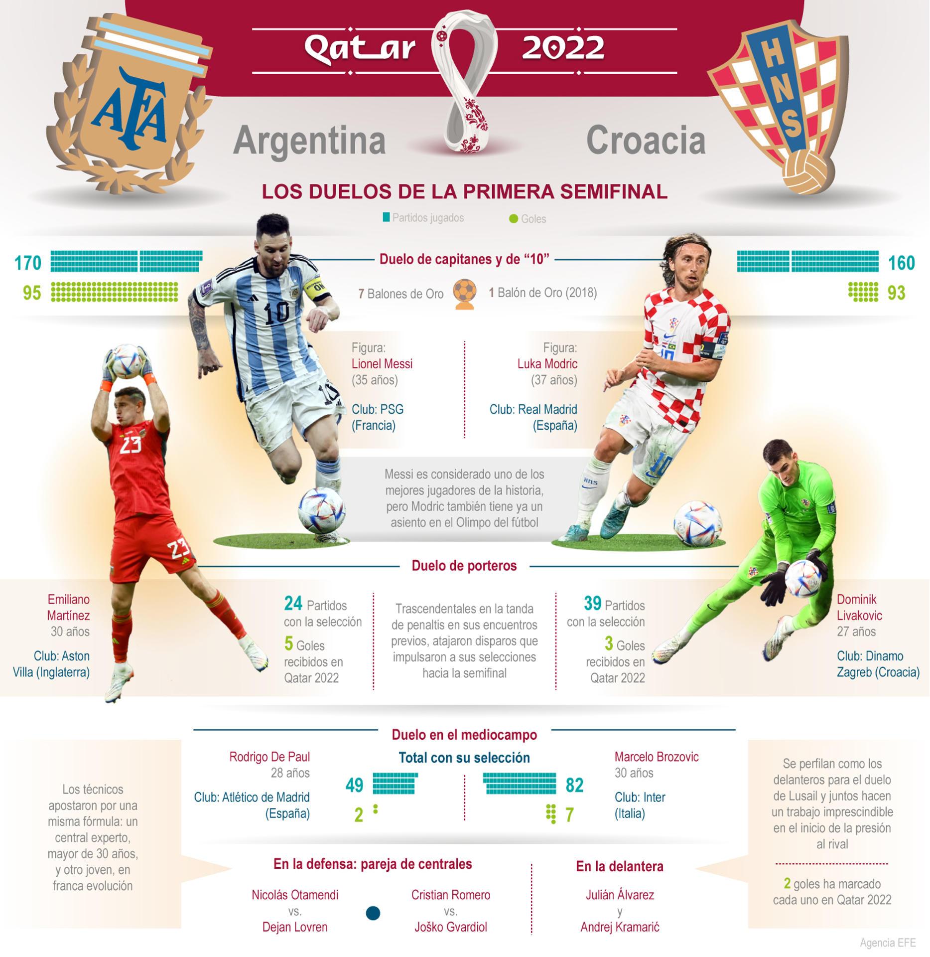La primera semifinal del mundial de Qatar 2022 entre Argentina y Croacia trae consigo también algunos duelos individuales interesantes, como los que mantendrán sus respectivas figuras, Lionel Messi y Luka Modric, así como los porteros Emiliano "Dibu" Martínez y Dominik Livakovic.