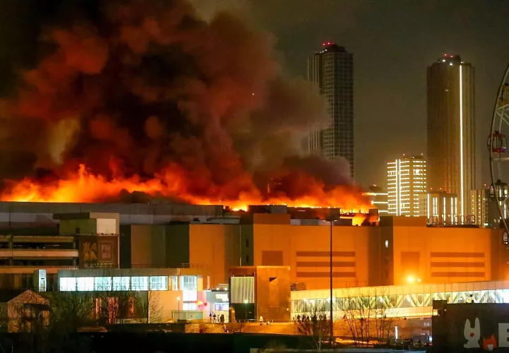 Los servicios de bomberos aún están intentado extinguir con la ayuda de medios aéreos el incendio que se declaró en el edificio del Crocus City Hall tras el ataque terrorista y que ha provocado el desplome de parte del tejado.