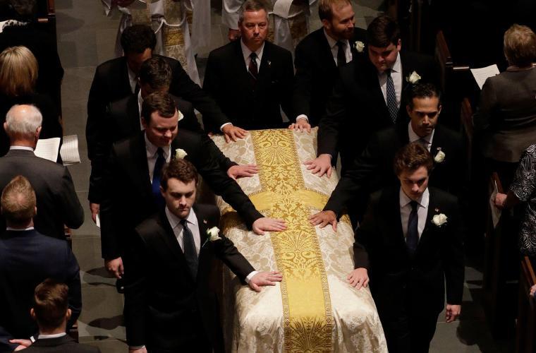 El funeral concluyó con una homilía del reverendo Russell Levenson, a la que prosiguió una versión del Himno de la Alegría para despedir al féretro de la ex primera dama, que abandonó el templo escoltado por su familia con el patriarca George H.W. Bush al frente, ayudado por su primogénito, el también expresidente George W. Bush (2001-2009), ya que está en silla de ruedas a sus 93 años.