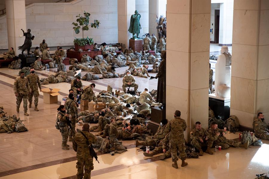 Por primera vez desde la Guerra Civil (1861-1865), varios centenares de soldados fueron acuartelados en el interior del Capitolio, donde tuvieron que dormir en los suelos y pasillos de mármol, rodeados de la suntuosidad de la sede legislativa.