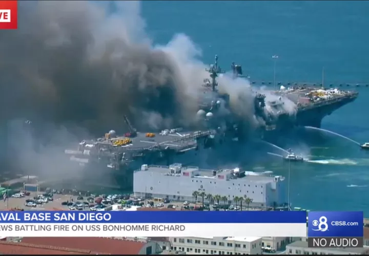 Un buque de guerra norteamericano, el Bohnomme Richard, estalló en llamas esta mañana cuando se encontraba anclado en la base naval de San Diego, California.