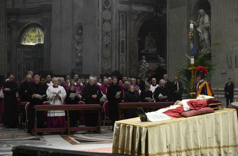 Ratzinger, que en 2013 fue el primer pontífice en renunciar en los últimos seis siglos, yacía sobre un catafalco de tela dorada a los pies del Altar de la Confesión y del baldaquino de Bernini, sobre el lugar en el que según la tradición fue sepultado San Pedro.