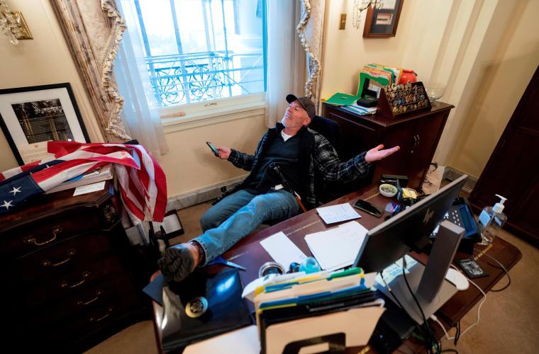 El individuo fue fotografiado sentado, con los pies sobre el escritorio de Pelosi, en el despacho de la presidenta de la Cámara de Representantes, una imagen que rápidamente dio la vuelta al mundo como epítome del caos generado por los trumpistas en el Congreso.