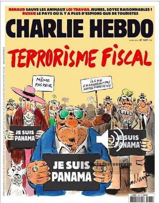 La revista "Charlie Hebdo" dedica su portada de esta semana a las revelaciones sobre la evasión de impuestos internacional bajo el título "Terrorismo fiscal", e ironiza con un lema para ricos, "Je suis Panamá", que parafrasea al que sirvió de movilización tras el atentado a la propia revista parisina.