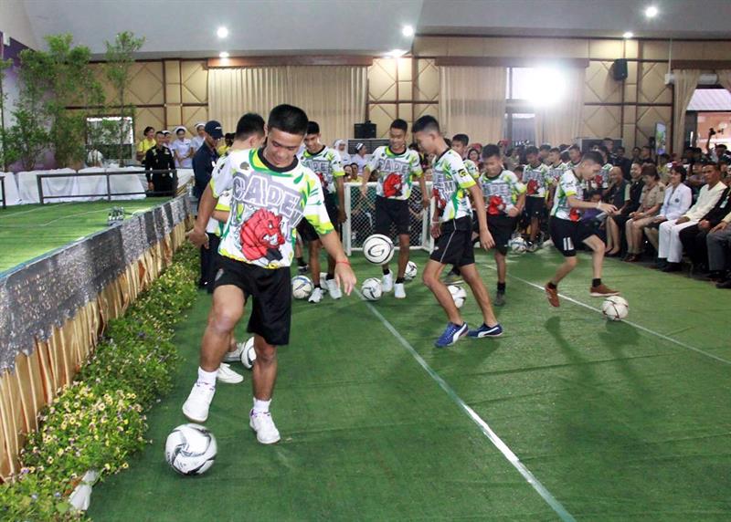 Los trece vestían la camiseta del equipo de fútbol al que pertenecen, los "Jabalíes Salvajes", y todos sonreía y presentaban un buen aspecto físico.