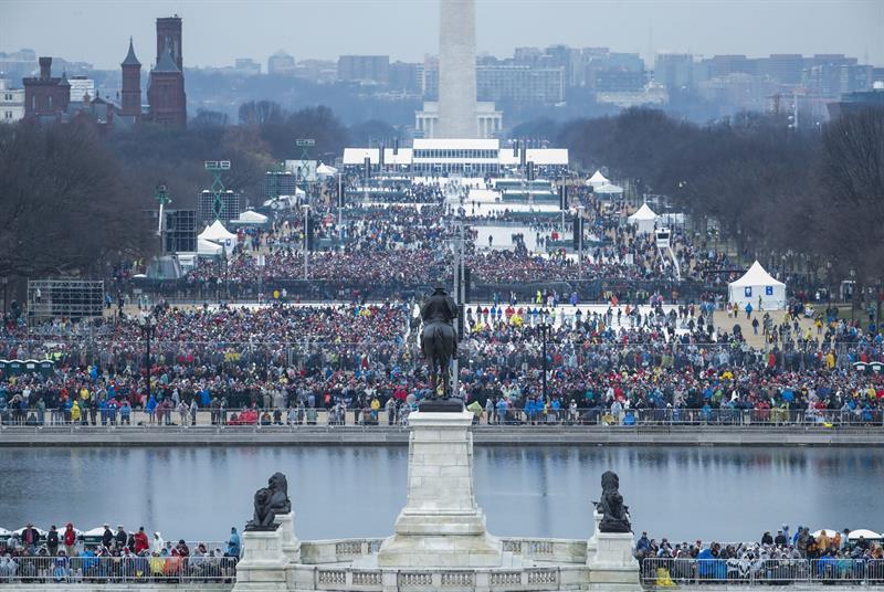 La ceremonia tiene lugar en las escalinatas del Congreso, frente a la inmensa explanada del National Mall, donde centenares de miles de simpatizantes del ganador de las elecciones de noviembre se congregan pese a una lluvia intermitente y el frío.