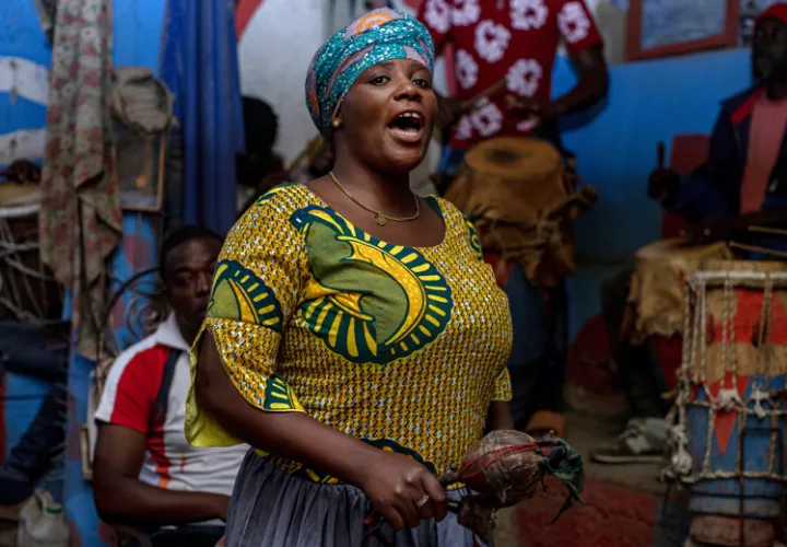 Alrededor, las personas se balancean al ritmo de los tambores rituales, mientras algunos entran en trance. Una mujer de edad avanzada, con un pañuelo rojo atado en la cabeza y cuentas de colores colgando del cuello, empieza a temblar y susurra palabras ininteligibles.