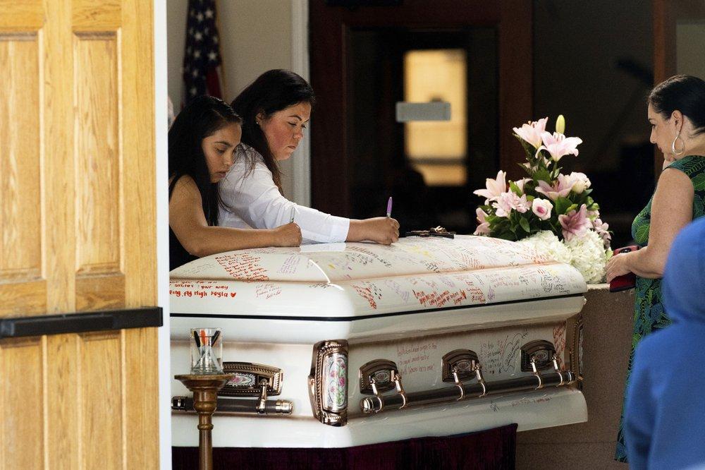 Familiares y amigos de la adolescente Keyla Salazar usaron marcadores de diferentes colores, para escribir mensajes en su ataúd blanco antes de su funeral, el primero que se realiza para las tres víctimas mortales de la masacre perpetrada en un festival de alimentos en California.