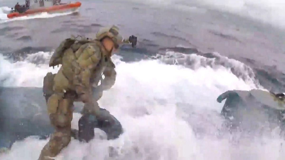 "Detén tu bote, ahora", ordenó el oficial, mientras los otros oficiales grababan el momento y se preparan con sus armas y sus gafas de visión nocturna. El jefe de la operación, a bordo de la embarcación de la Guardia Costera, es quién en el video indicó a los narcotraficantes que detuvieran la marcha, justo antes de que el resto del equipo salte hacia el vehículo.