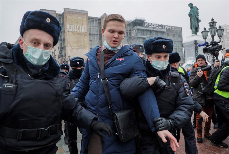 En Moscú, donde la marcha para exigir la liberación de Navalni empezó a las 14.00 hora local (11.00 GMT) en la céntrica plaza Púshkinskaya, las detenciones comenzaron incluso antes de la cita, según pudo constatar Efe.