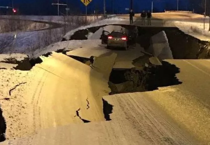 Las fotografías publicadas en las redes sociales mostraron daños que incluían el derrumbe de las placas del techo de una escuela secundaria de Anchorage y la deformación de algunos caminos. Una imagen mostraba un coche varado en una isla de pavimento, rodeado de grietas cavernosas donde el terremoto partió la carretera.