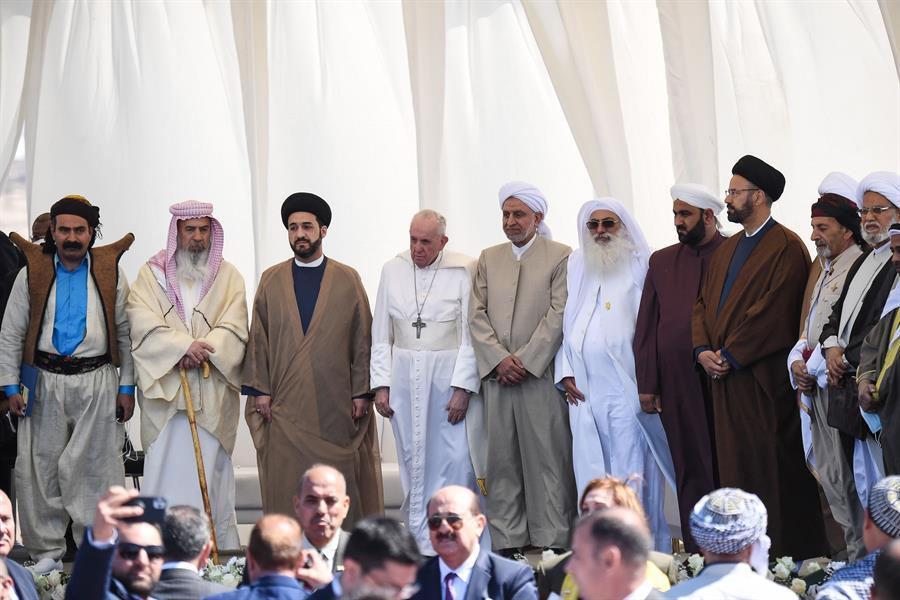 "Hostilidad, extremismo y violencia no nacen de un espíritu religioso; son traiciones a la religión", clamó Francisco rodeado de los representantes de las religiones que forman este mosaico de civilizaciones que es Irak, suníes, chiíes, zoroastrianos y yazidíes, aunque no de los judíos.