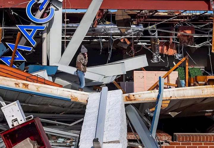 El NWS indicó que la tormenta siguió "más de 250 millas a través de varios estados (incluidos Arkansas, Missouri, Tennessee y Kentucky)", tuiteó el NWS en Little Rock (Arkansas). "Se generaron uno o más tornados mortales, y se observaron daños estructurales importantes".