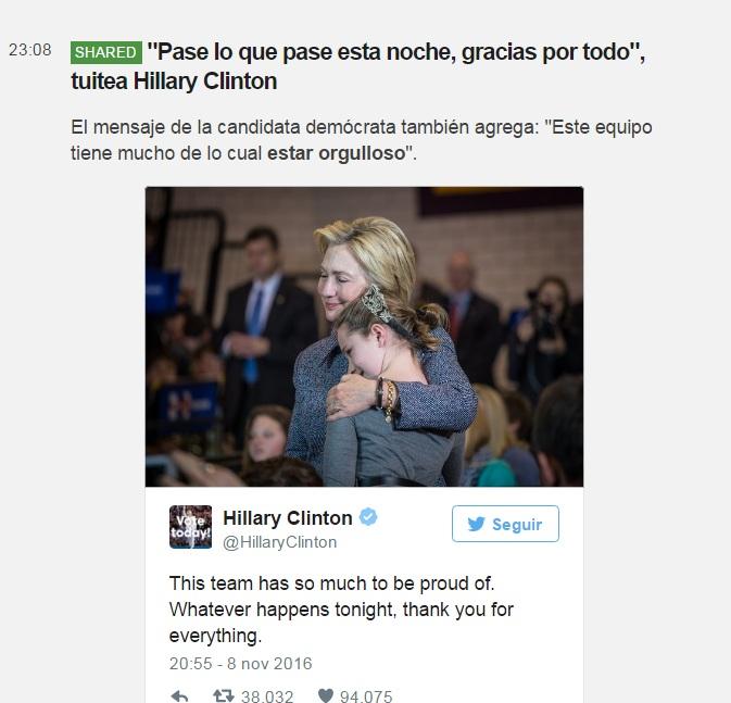Mundo 09/11/16 - 04:15 AM El tuit de Hillary que acaparó la atención La candidata demócrata agradeció a su equipo, "pase lo que pase esta noche" Etiquetas Elecciones 2016