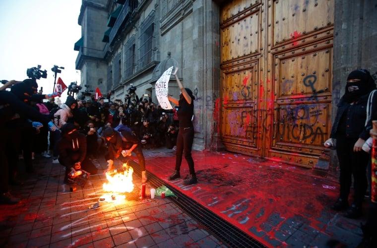 En su protesta, frente al periódico La Prensa, en pleno centro de la capital mexicana, las mujeres realizaron pintas y vandalizaron las instalaciones del periódico La Prensa, entre ellos cuatro vehículos de reparto, prendiendo fuego a uno de ellos.