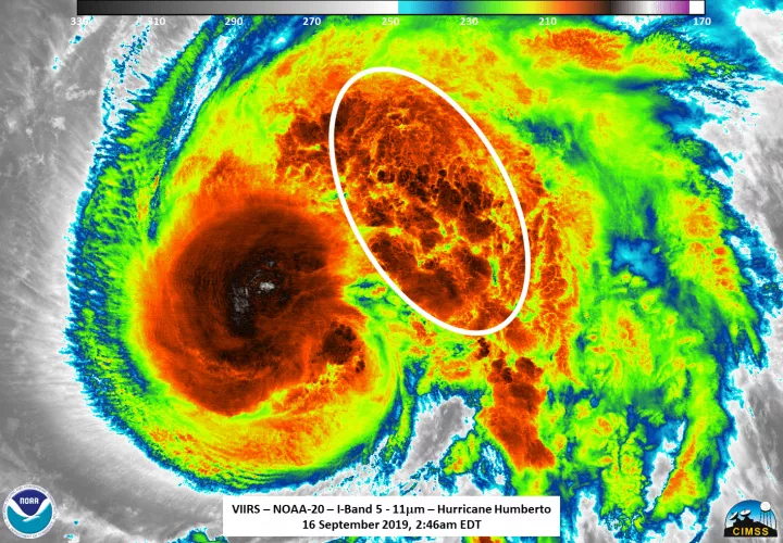 Esto significaría que Humberto generaría vientos máximos sostenidos de más de 110 millas por hora (177 km/h), aunque se prevé que pierda algo de fuerza antes de llegar al territorio insular británico del Atlántico Norte.