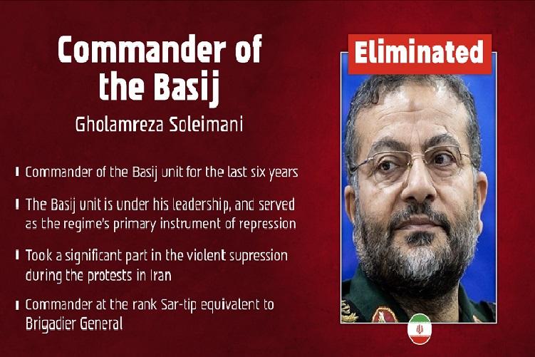 La Guardia Revolucionaria iraní confirmó este martes la muerte de Gholamreza Soleimani, comandante de la milicia paramilitar Basij (encargada de la represión ciudadana y vinculada a la Guardia) en los bombardeos, según informaron agencias oficiales.