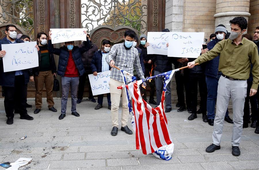 "La negociación es una traición", rezaba una de las pancartas de los manifestantes, que quemaron las banderas israelí y estadounidense y fotografías de Trump y Biden al grito de "muerte a EEUU" y "muerte a Israel".