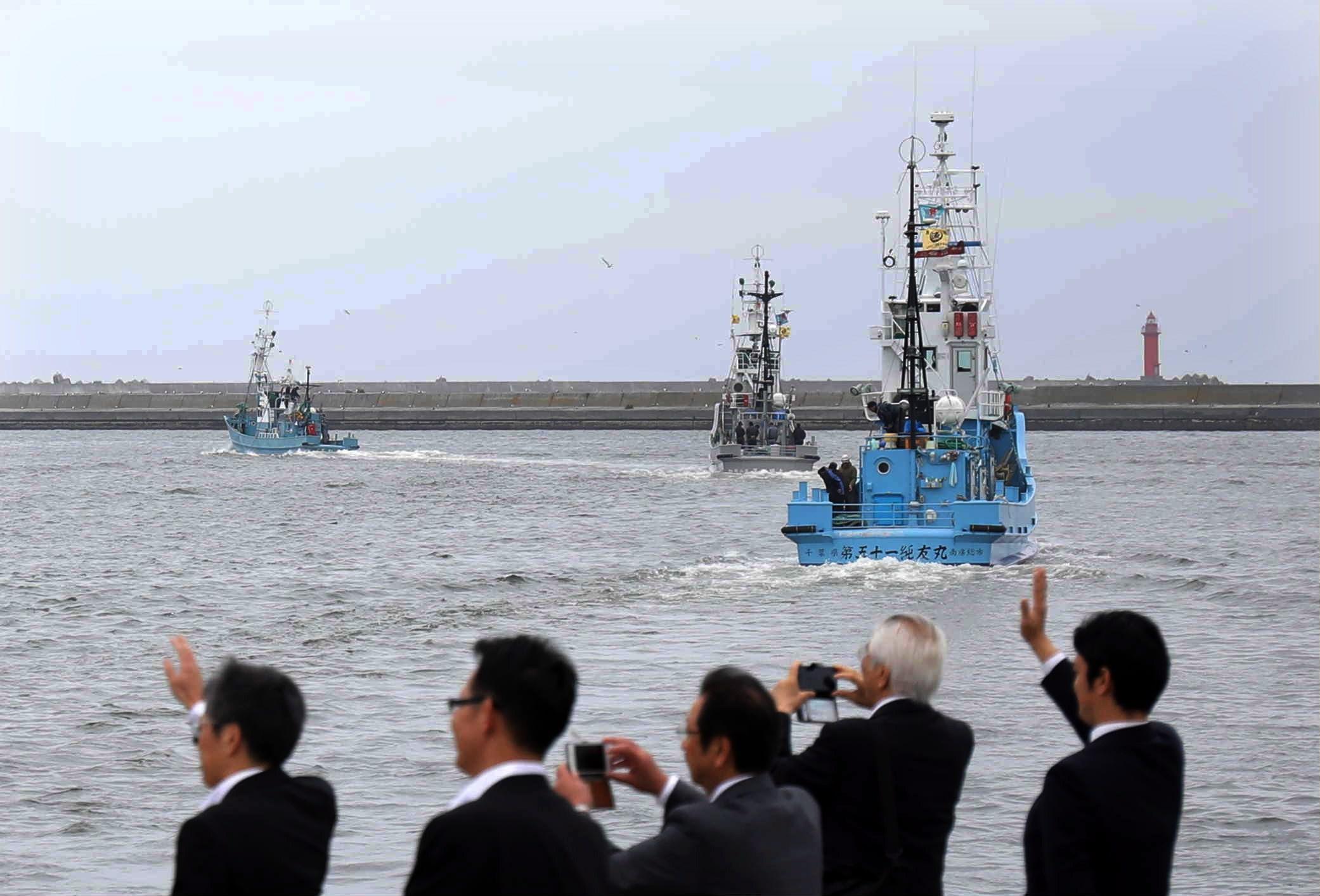 Trabajadores de la Agencia de Pesca e industrias pesqueras ven partir a balleneros en el puerto de Kushiro en Japón este lunes.