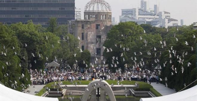 Unas 50.000 personas asistieron a la ceremonia en el Parque Conmemorativo de la Paz en Hiroshima, cerca del epicentro de la bomba.