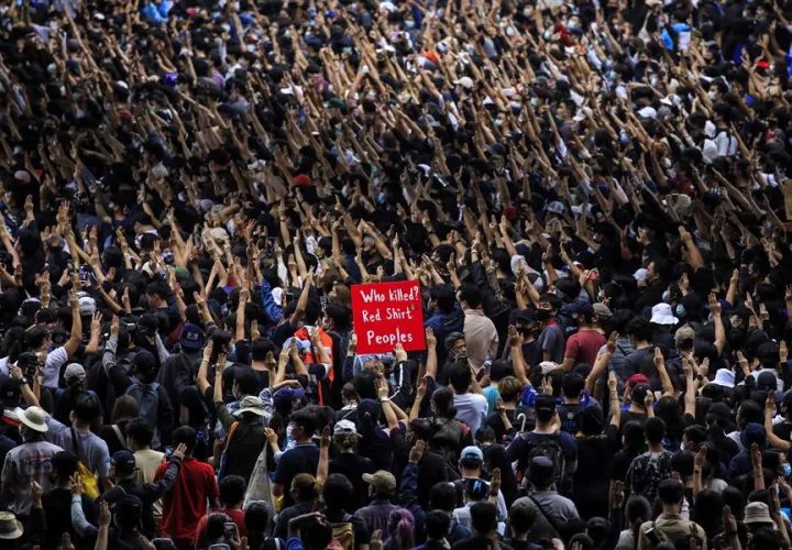 Con sus habituales gritos "fuera Tu" (apodo del primer ministro, Prayut Chan-ocha) o "Liberad a nuestros amigos" mientras mostraban el signo de los tres dedos alzados, tomado de la película "Los juegos del hambre", las protestas lideradas por estudiantes discurrieron un día más de manera pacífica.