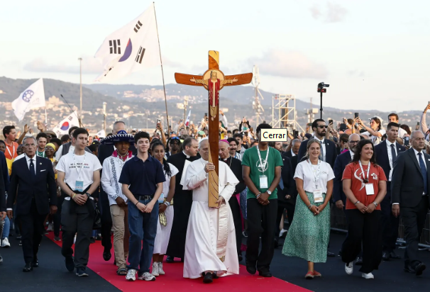 Terminado el recorrido, descendió del coche y tomó con sus manos la cruz del Jubileo de madera para encabezar a pie una procesión con decenas de muchachos de distintas nacionalidades hasta el escenario.