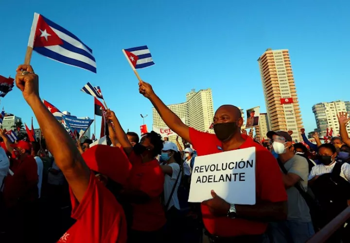 Miles de personas se concentran en La Habana en un acto de apoyo a la Revolución organizado por el Gobierno cubano al que asisten el exmandatario Raúl Castro y el presidente, Miguel Díaz-Canel, casi una semana después de que masivas marchas de protesta sacudieran la isla en medio de una fuerte crisis.