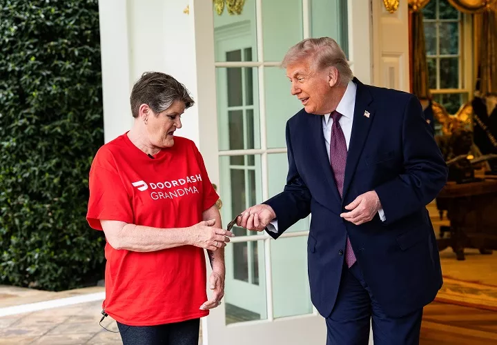 En una escena cuidadosamente preparada para las cámaras de televisión, Sharon Simmon, de 58 años, llegó al jardín sur de la Casa Blanca en un vehículo de la empresa de reparto DoorDash y entregó al mandatario tres bolsas en la puerta del Despacho Oval.