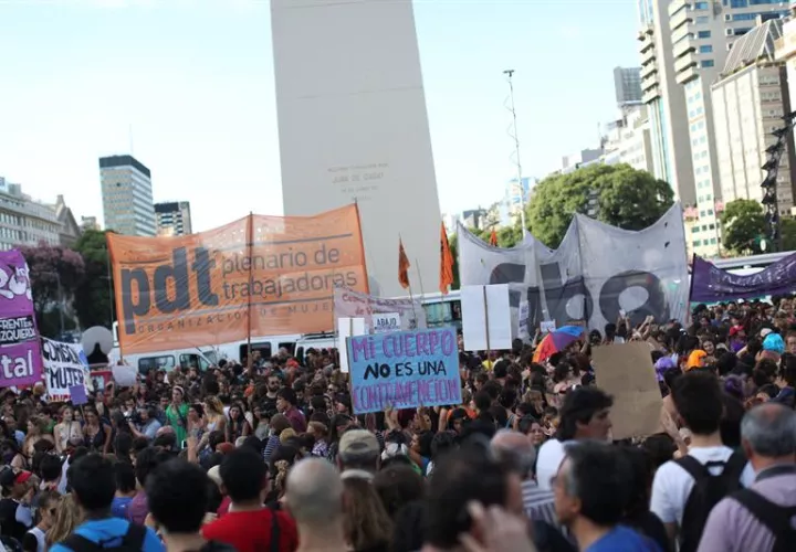 El "tetazo" celebrado en el emblemático Obelisco de Buenos Aires reunió a casi 1.000 personas, cifra dividida entre los hombres que miraban y las manifestantes, de las que en torno a cien enseñaron sus pechos pintados para protestar en contra de la cosificación del cuerpo de la mujer.