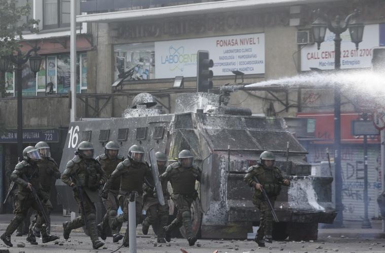 Mientras en la Plaza Italia miles de personas protestaban en ambiente festivo con banderas y proclamas en contra del Gobierno por la desigualdad, unos cientos de metros más allá encapuchados se enfrentaban a las Fuerzas Especiales de Carabineros (Policía militarizada) entre pedradas y bombas lacrimógenas.