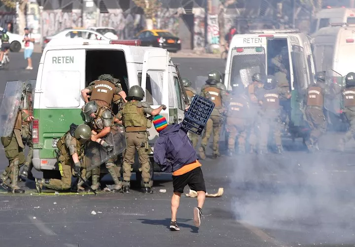 El centro de Santiago volvió ayer viernes a ser escenario de duros choques entre manifestantes y agentes, días después de que fuese restituido el criicado gobernador de la ciudad, Felipe Guevara. EFE.