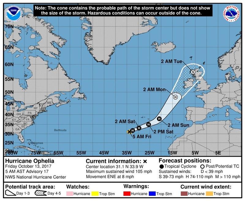 Una vez superadas las Azores, Ofelia virará hacia el noreste y aumentará su velocidad de traslación hacia aguas más frías del Atlántico, lo que provocará que se debilite ligeramente en las próximas 48 horas.