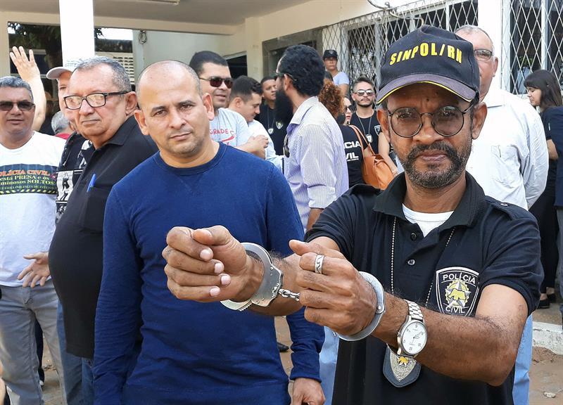 Un grupo de policías civiles del estado de Río Grande do Norte en huelga desde el pasado 19 de diciembre se colocaron las esposas y se presentaron este miércoles ante las autoridades con el fin de ser detenidos, aunque la captura no fue llevada a cabo.