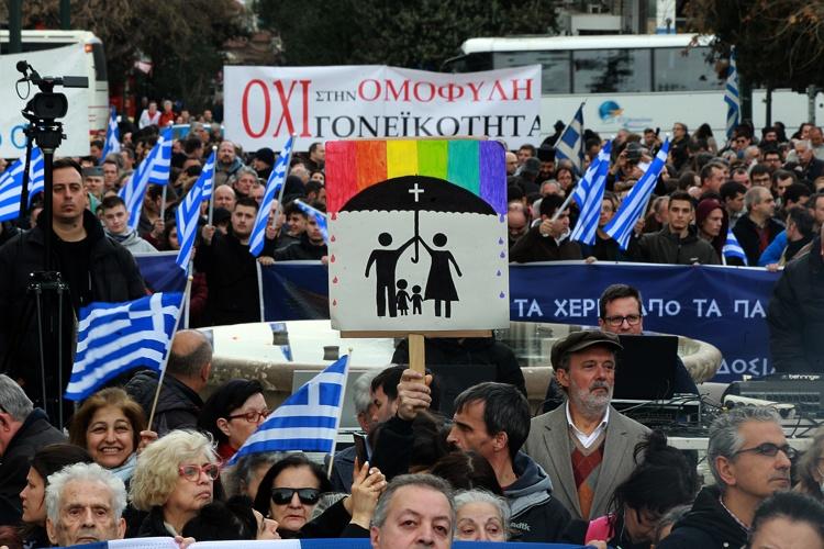 "La homosexualidad no es un derecho humano" y "patria - religión - familia", se podía leer en algunas de las pancartas que levantaron los manifestantes frente al Parlamento de Grecia en la plaza Syntagma, muchos de los cuales portaban banderas griegas e imágenes de santos.