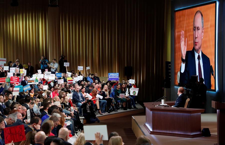 Durante más de cuatro horas de comparecencia, Putin rompió una lanza en favor de su colega estadounidense, al que ha invitado a celebrar el próximo 9 de mayo en Moscú el 75º aniversario de la victoria sobre la Alemania nazi.