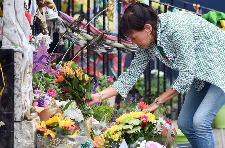 Cientos de personas se concentraron ayer al pie de la torre de viviendas Grenfell, de la ciudad de Londres, para recordar a las 72 víctimas mortales del incendio que devastó hace un año el edificio. EFE.