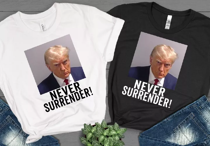 La campaña comenzó a vender camisetas, carteles, calcomanías para parachoques y refrigeradores de bebidas con la foto policial de Trump con el ceño fruncido. Los artículos llevan el lema "¡NUNCA TE RINDAS!" y su precio oscila entre $12 y $34.