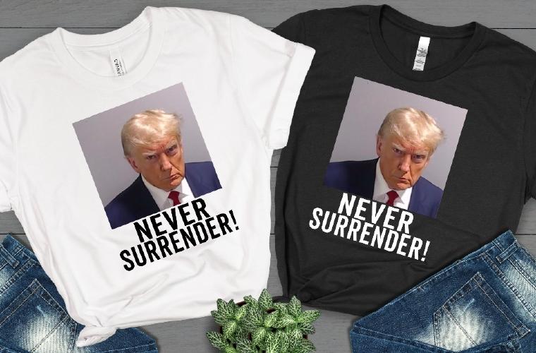 La campaña comenzó a vender camisetas, carteles, calcomanías para parachoques y refrigeradores de bebidas con la foto policial de Trump con el ceño fruncido. Los artículos llevan el lema "¡NUNCA TE RINDAS!" y su precio oscila entre $12 y $34.