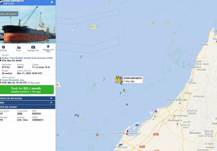 El granelero 'Star Gwyneth', que navega bajo bandera de las Islas Marshall pero pertenece a la naviera griega 'Star Bulk Carriers', fue alcanzado por un proyectil cuando estaba anclado a unas 50 millas náuticas al noroeste de Dubái, indicó la compañía desde su sede en Atenas.