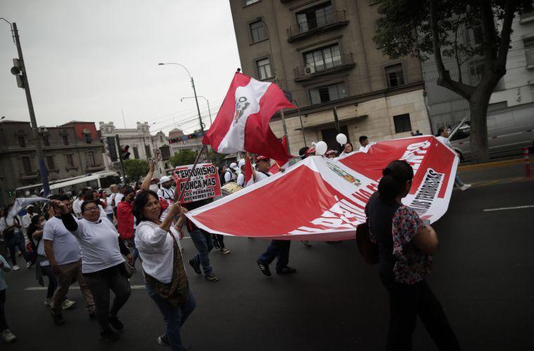 Cerca de un millar de peruanos marcharon la tarde de este viernes en Lima para mostrar su apoyo a las Fuerzas Armadas y a la Policía Nacional, tras las protestas antigubernamentales de los últimos días en diversos puntos del país en las que han muerto, hasta el momento, 20 persona.